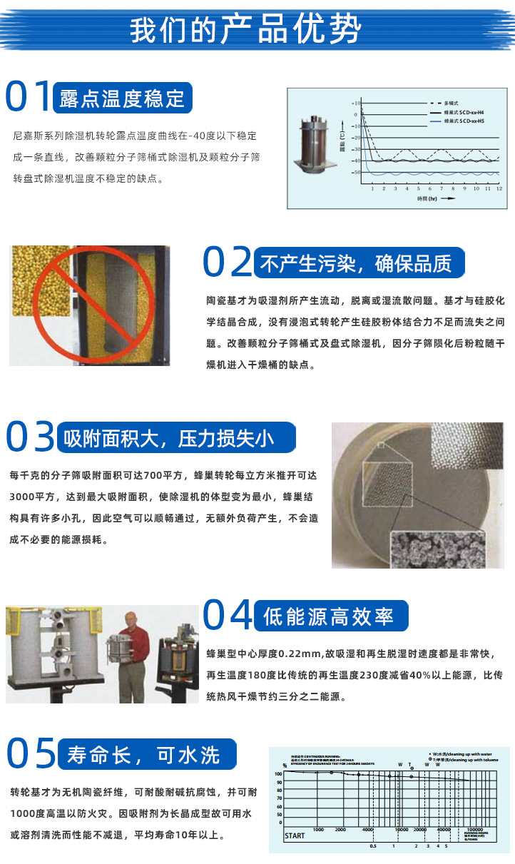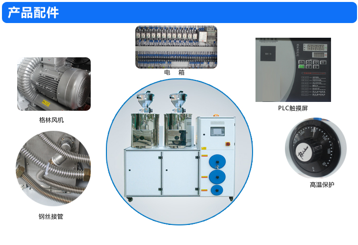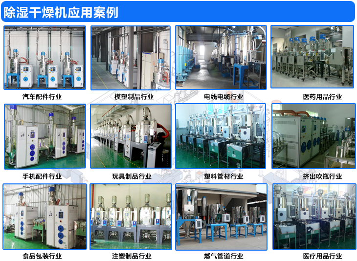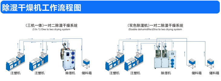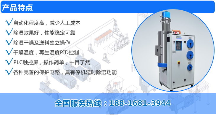 尼嘉斯牌除濕干燥機送料組合集干燥、除濕及送料三種功能為一體,特別適用于處理吸濕性很強的塑料,嚴格控制原料中的水份,是加工高品質塑料制品聽關鍵,本公司采用的是日本陶瓷纖維為基材的蜂巢轉輪,干燥空氣輕松可達到-40℃露點,理想情況下再達到-50℃甚至更低的露點,露點溫度穩定,保證了成形塑料制品的物理性能(強度、硬度、透明度等)。該系列產品實現了自動化,降低操作員勞動強度,節省空間