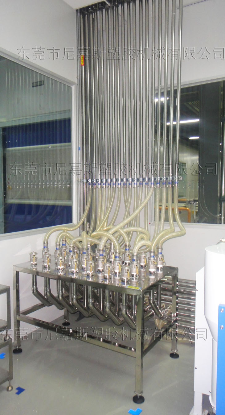 中央供料系統是為注塑車間的塑料產品生產而設計的,實現了不間斷無人化連續成型作業。可根據需要改變原料品種、多顏色材料的組合使用方式,實現著色工序的自動化。系統能夠以全自動方式再生和使用注口冷料,能夠對所有供料設備的控制,并防止了儲料倉內阻塞現象的發生,通過設置中央監控臺實現全自動化。