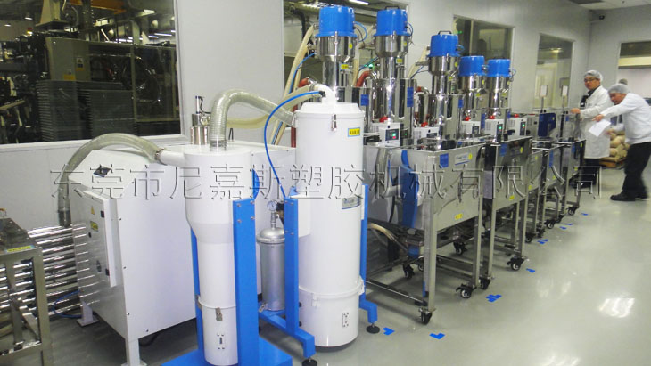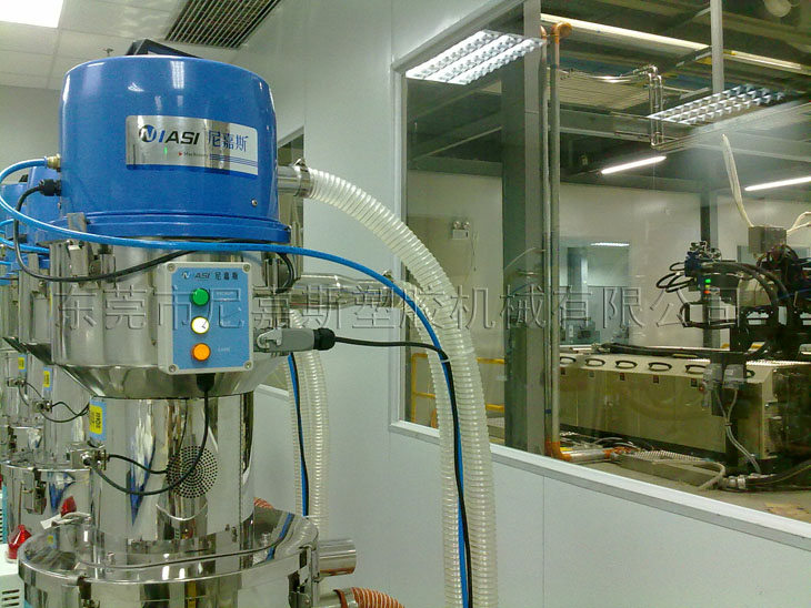中央供料系統(tǒng)采用真空傳送方式,通過(guò)集中的管路系統(tǒng)將塑料原料從儲(chǔ)料罐輸送到中央除濕干燥系統(tǒng),然后將干燥后的原料輸送到每臺(tái)注塑機(jī)中。中央供料系統(tǒng)采用“一臺(tái)機(jī)器一根管”的設(shè)計(jì)方式,保證整個(gè)系統(tǒng)的空氣對(duì)原料進(jìn)行輸送,防止除濕干燥后的原料回潮。同時(shí)在每個(gè)輸運(yùn)行穩(wěn)定,絕無(wú)堵料的現(xiàn)象發(fā)生。它配合中央除濕干燥系統(tǒng)使用,可使用除濕干燥送循環(huán)后會(huì)對(duì)輸送管線(xiàn)進(jìn)行清理,確保管路內(nèi)沒(méi)有殘余的粒料,在避免原料回潮的同時(shí),也保證了加入注塑機(jī)中的原料性能的一致。在真空負(fù)壓作用下原料中原由的粉塵會(huì)通過(guò)粉塵過(guò)濾系統(tǒng)被過(guò)濾出來(lái),有助于提高成型產(chǎn)品的質(zhì)量。