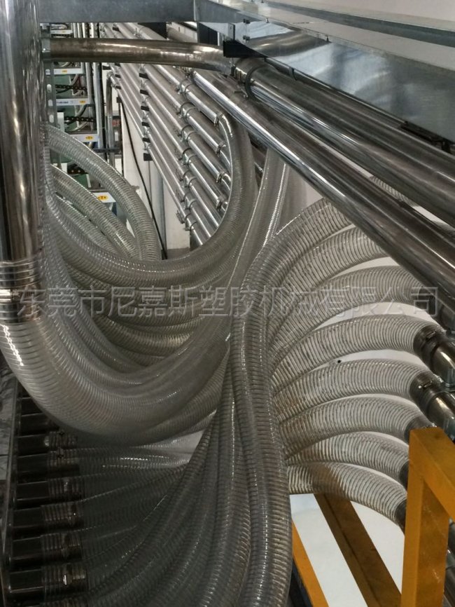 尼嘉斯中央供料系統采用一臺機一根管,密封式回路設計方式,保證整個系統運行穩定,絕無塑膠回潮、堵料現象發生。它配合中央干燥機(除濕機)系統使用,可使干燥空氣對原料進行再次干燥,防止干燥后的塑膠回潮,同時在每個輸送循環后對輸送管進行清理,確保管道內沒有殘料。在避免原料回潮的同時也保證加入注塑機中原料一致性,在真空負壓同進作用下,原料中原有的粉塵經過過濾器(集塵器)系統濾出,有利提高產品質量。
