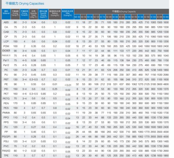 時請參照以下烘干時間來采購合適配置注塑機型號的干燥機